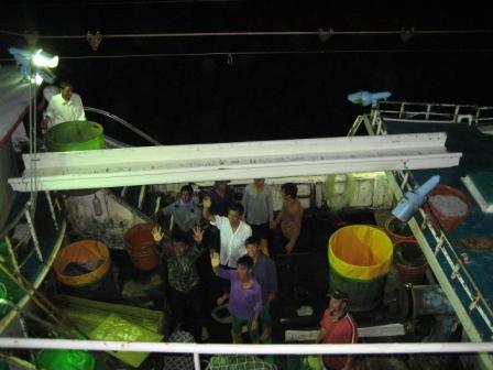 被救船员证实,该渔船船名为大福二号。共有13名船员,台湾船长1名,3名大陆船员,4名印尼船员和5名越南船员,最小仅20岁。他们刚加满500吨油到达该海区。 25日半夜,在作业时发现机舱起火,由于火势蔓延迅速无法扑灭,大约凌晨3:00,他们弃船跳海逃生。在海中漂浮超过30小时,遇到Ocean Honey轮获救。 船员获救上船时,受到极大惊吓,尤其几名年轻船员登轮后不断颤抖,流泪。我轮船员纷纷拿出矿泉水、牛奶果汁安慰他们。获救船员上船后,身体状况良好,很快恢复体力。仅有几名船员在救火过程中有轻微烫伤或擦伤,得到简单治疗。大厨专门为他们做了晚餐。